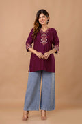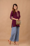 Maroon Garden Cotton Short Kurta - Maroon with Red Floral Embroidery