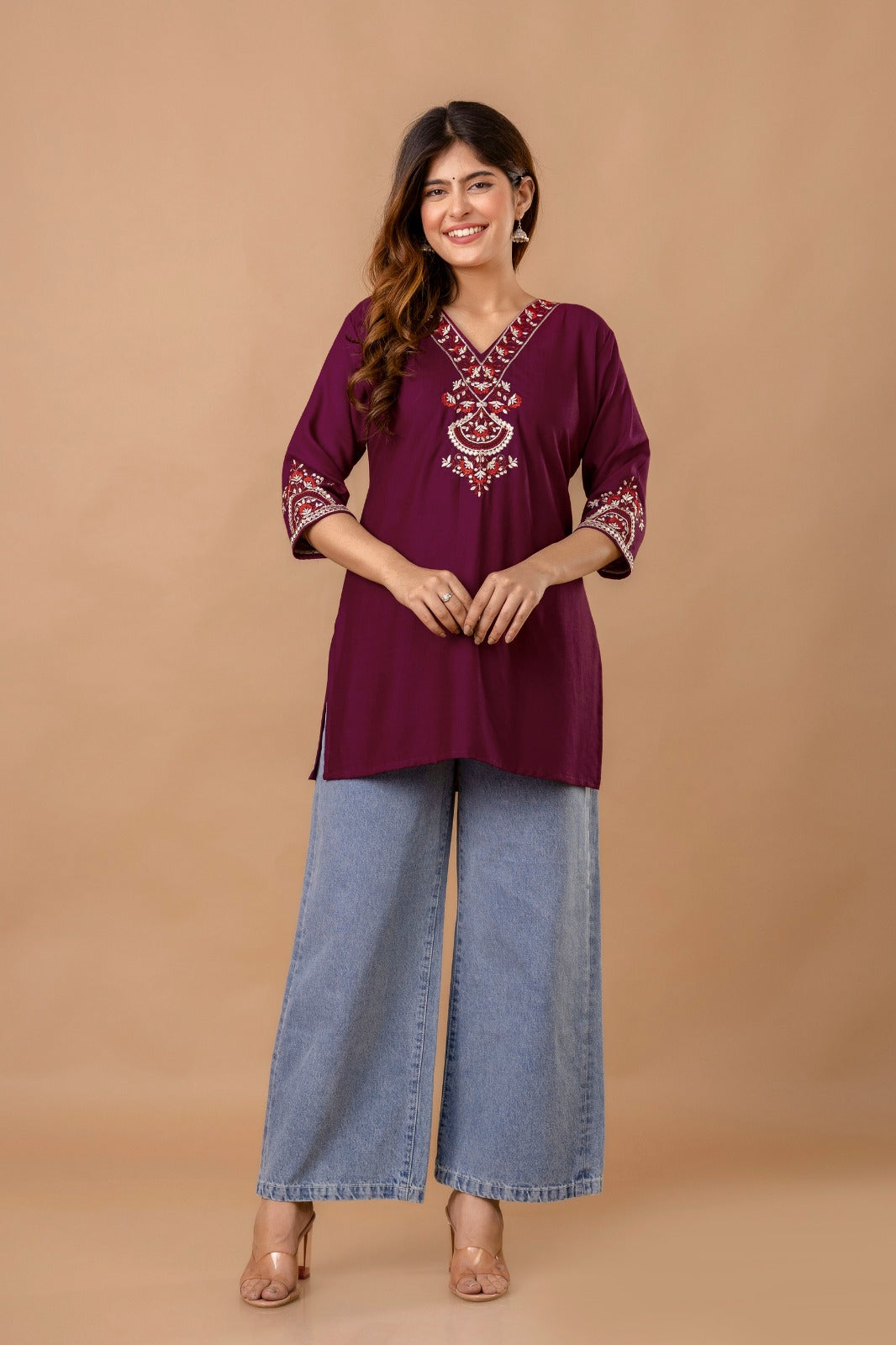 - Design: Red floral embroidery on the neckline and sleeves