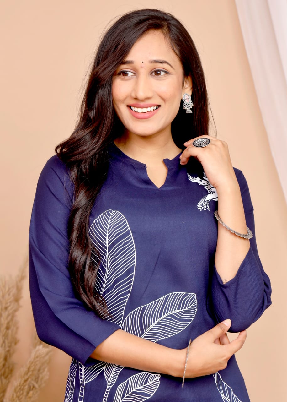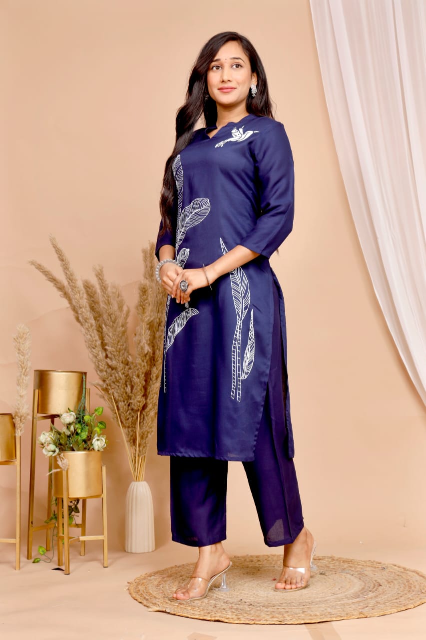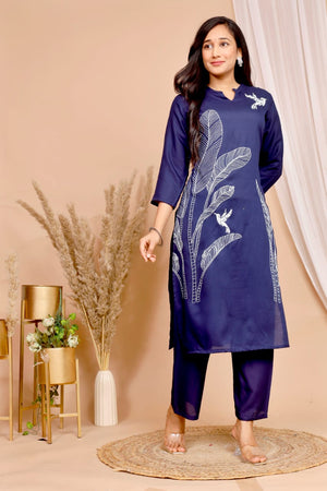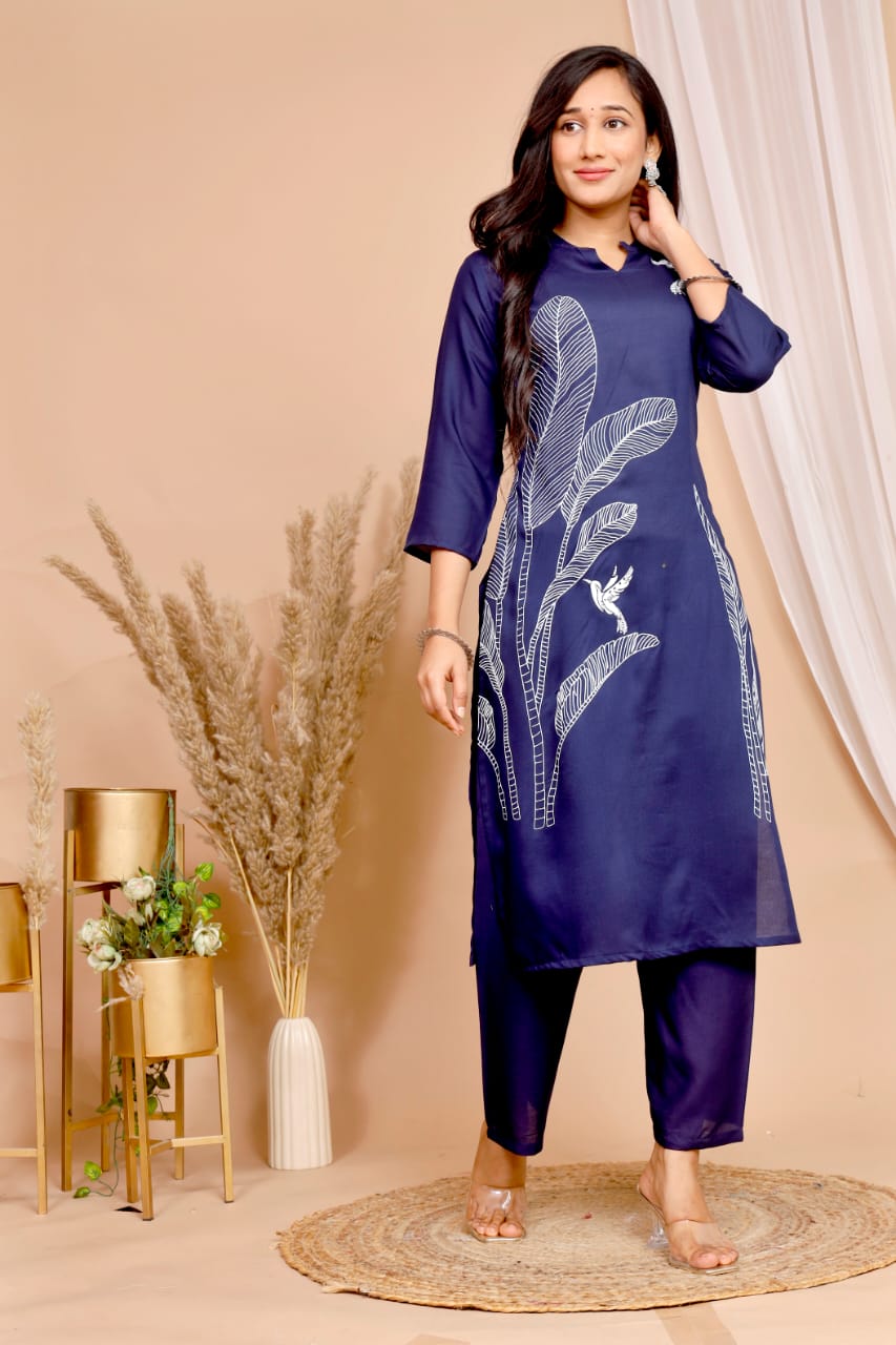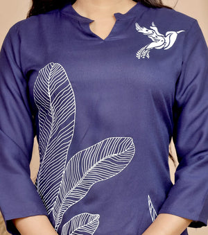Step into subtle sophistication with our Blue Bird Co-Set, designed for women who appreciate elegance with a modern twist. Crafted in a rich navy-blue tone, this ensemble features beautifully detailed white bird and leaf motifs that add a serene, artistic charm to the outfit.
