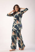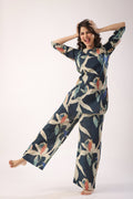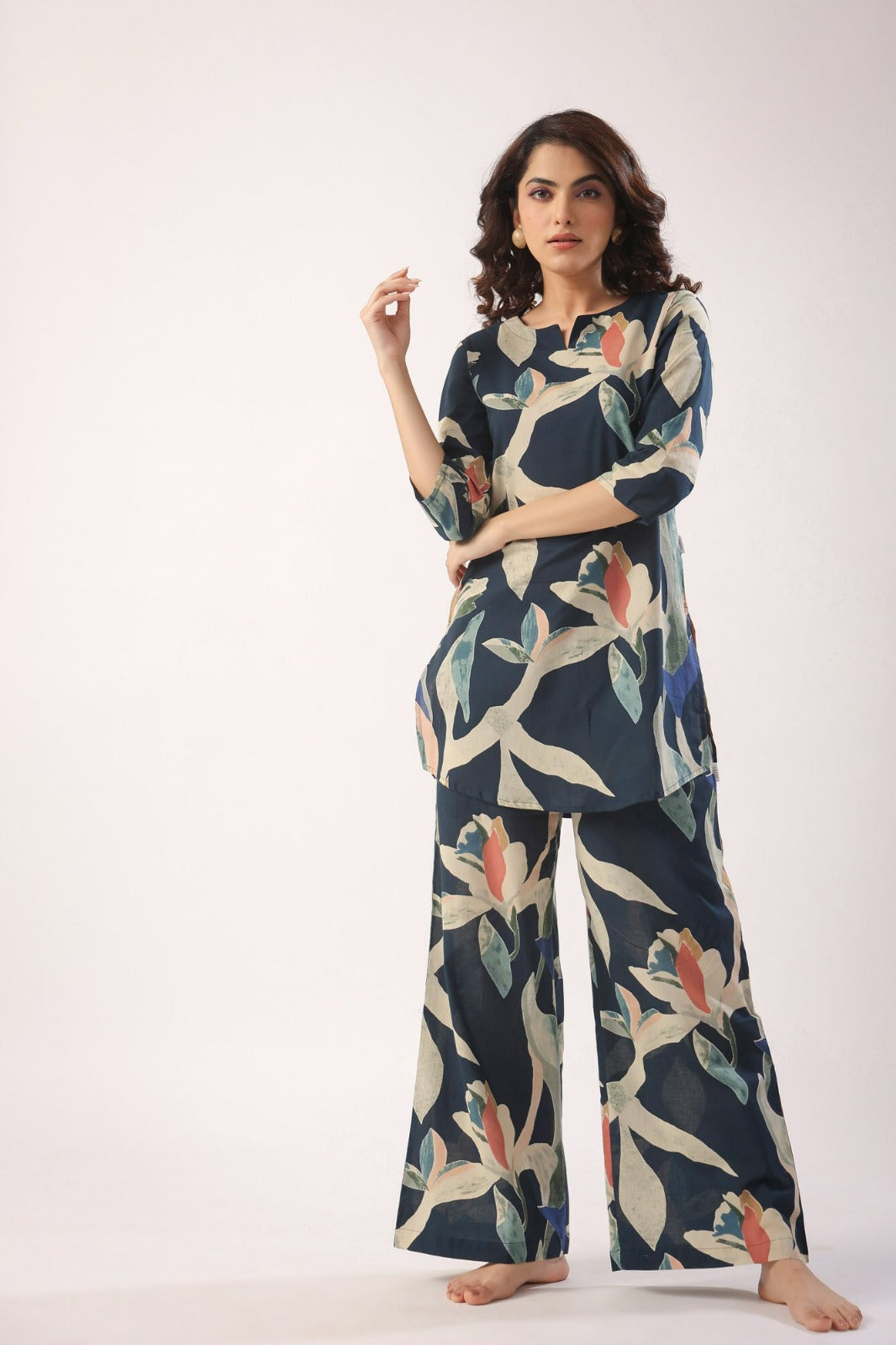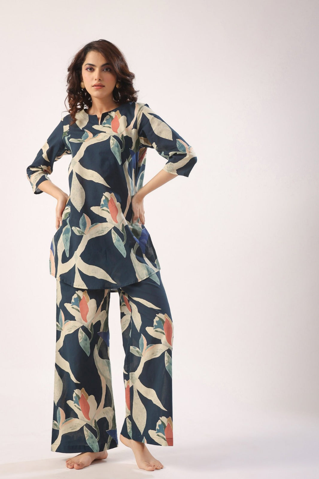Navy Cotton Abstract Floral Cord Set - Top and Matching Pants