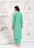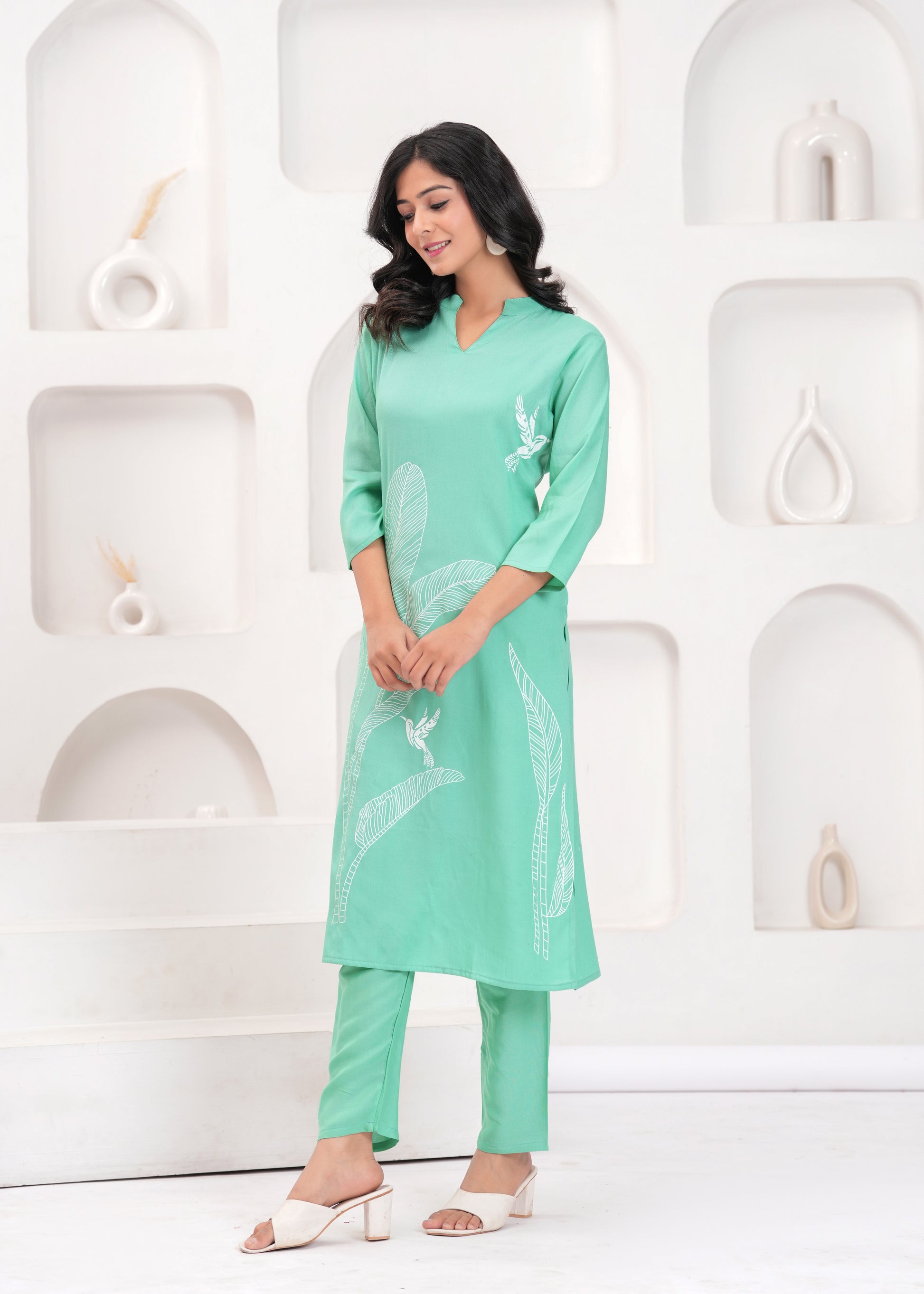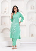 This enchanting green co-ord set features a long tunic and matching pants, adorned with intricate white embroidery of leaves and a bird motif. The tunic's straight fit and the sleek silhouette of the pants create a harmonious and elegant look, perfect for semi-formal gatherings or daytime events. Pair it with beige heels and delicate accessories to elevate your style effortlessly.