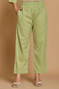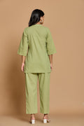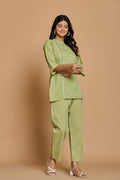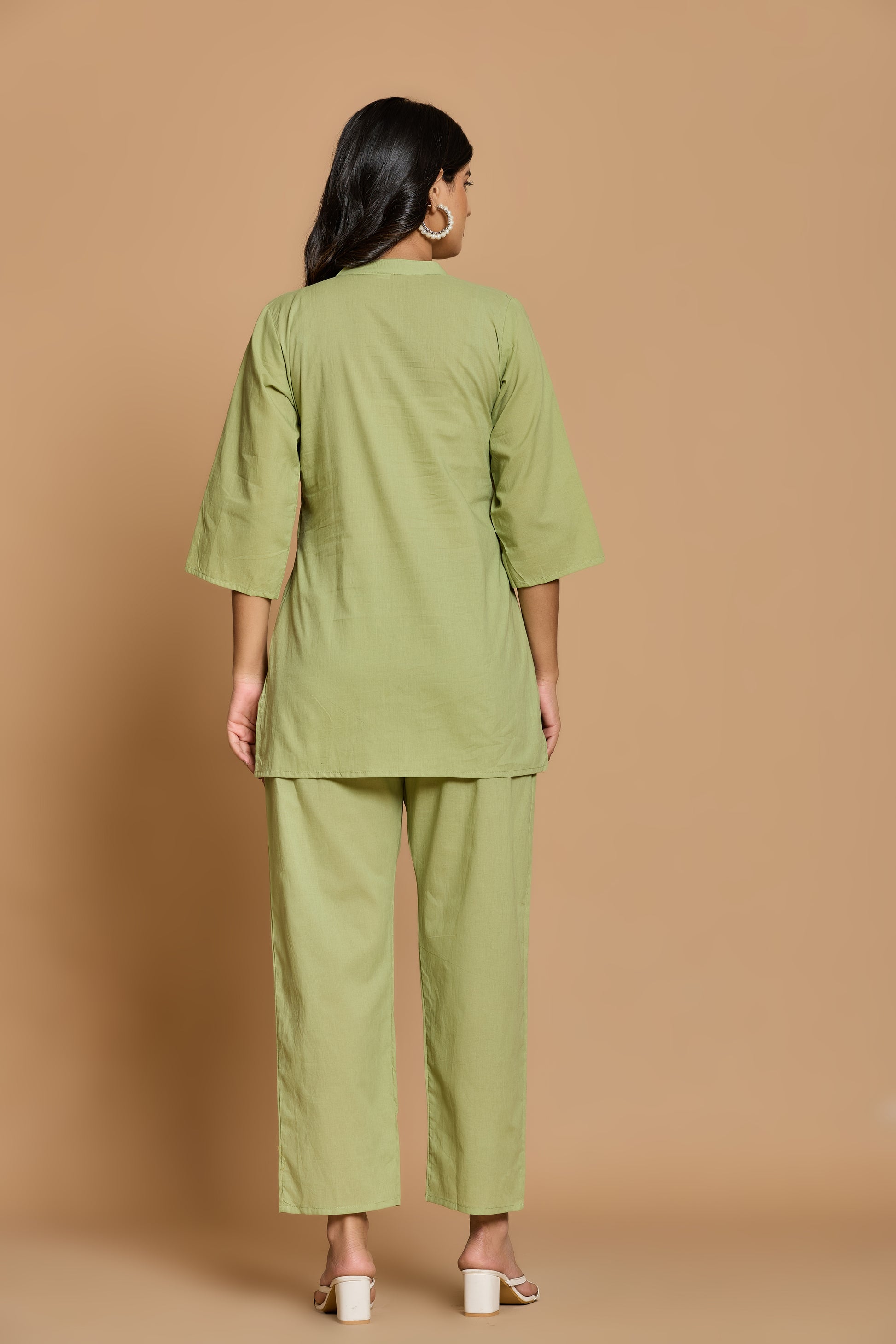 Step into everyday elegance with our Olive Essence Coord Set. Crafted in a refreshing green hue, this ensemble blends comfort with minimal chic. The kurta features dainty button detailing and delicate lace accents along the princess lines, adding structure and subtle charm. Paired with matching straight-fit pants, this set is a perfect pick for a breezy, confident day look.