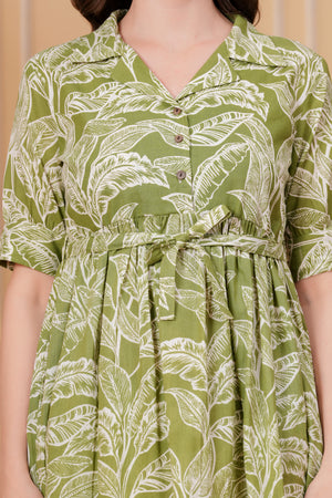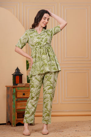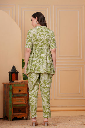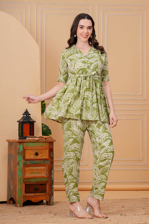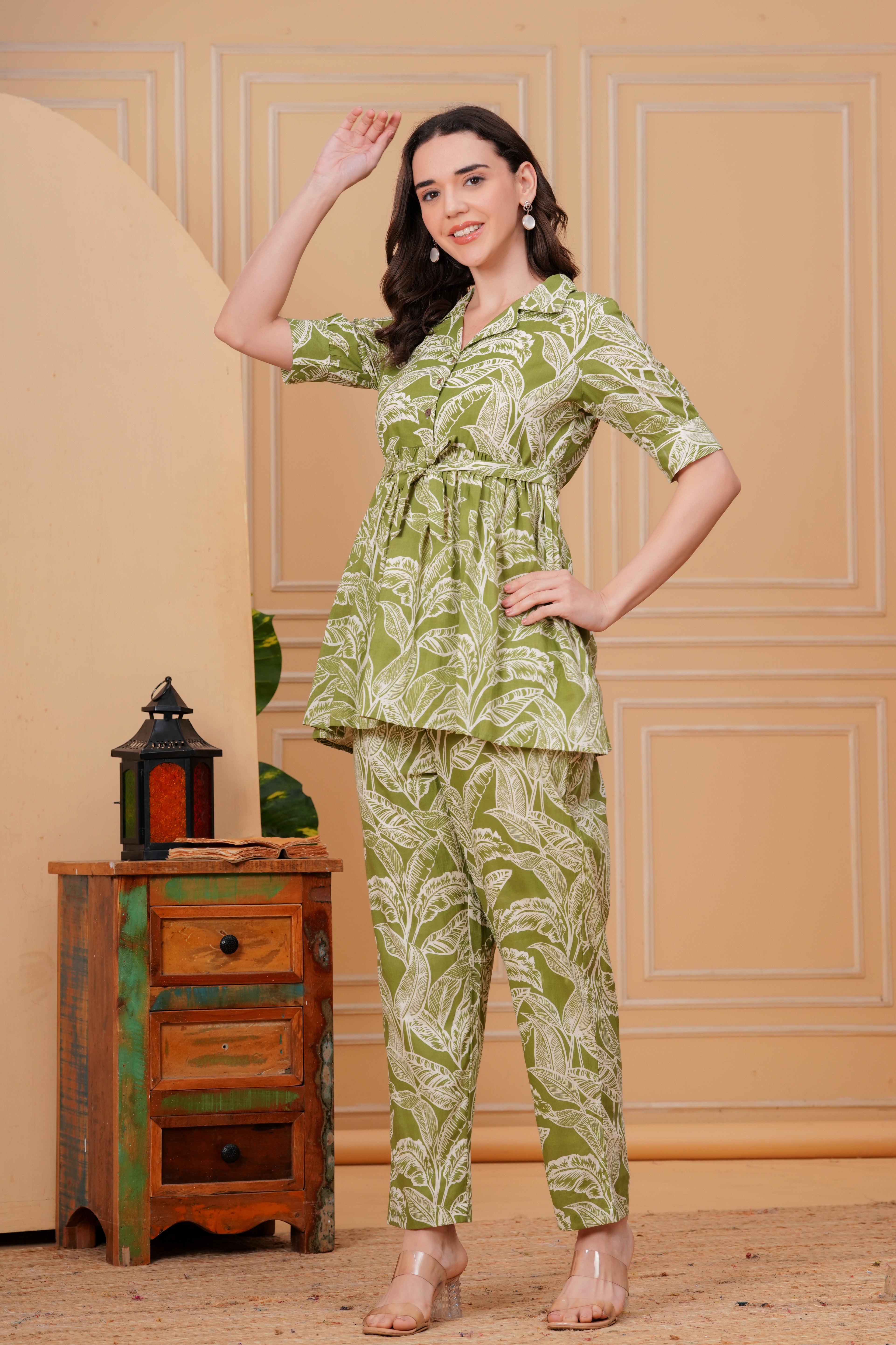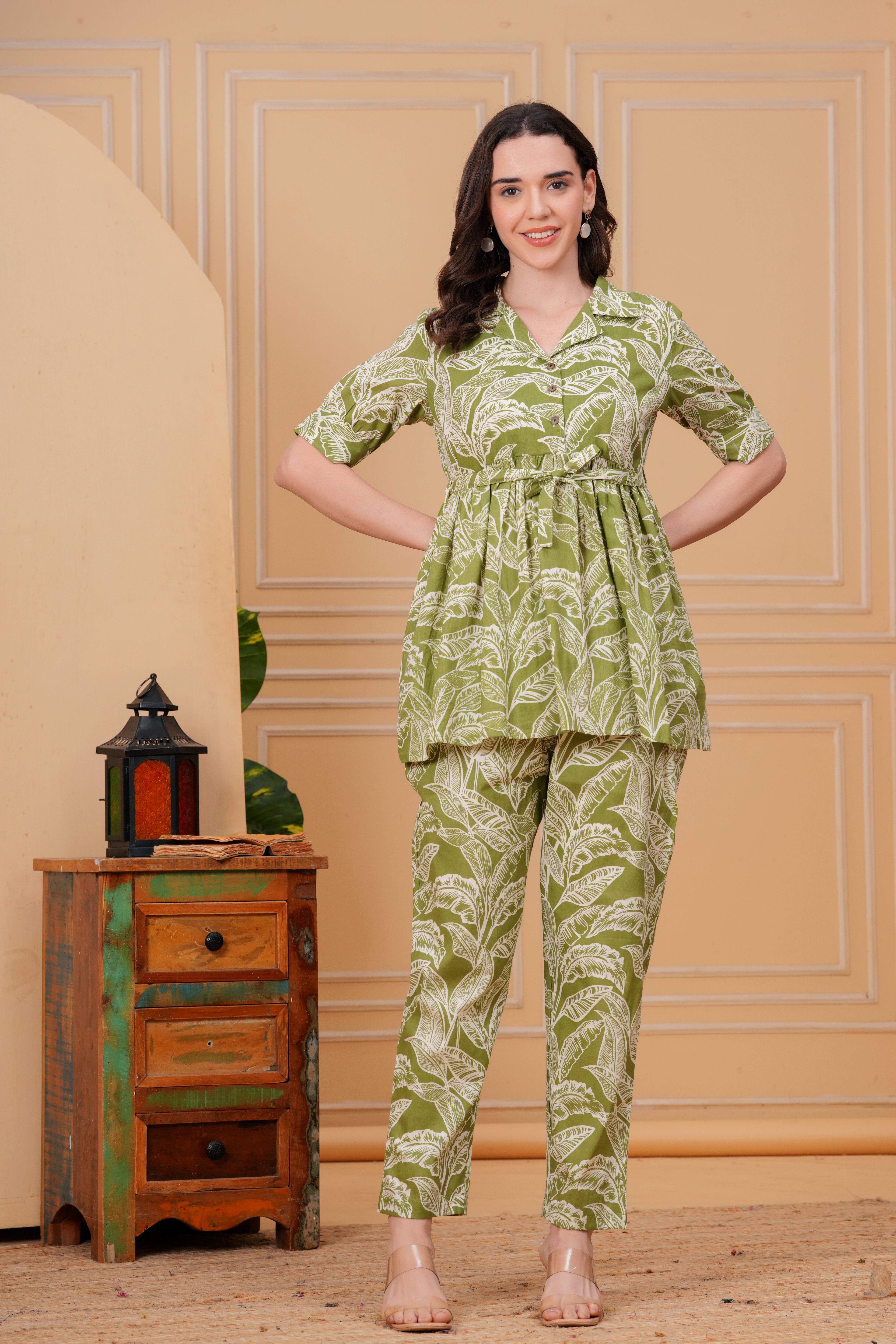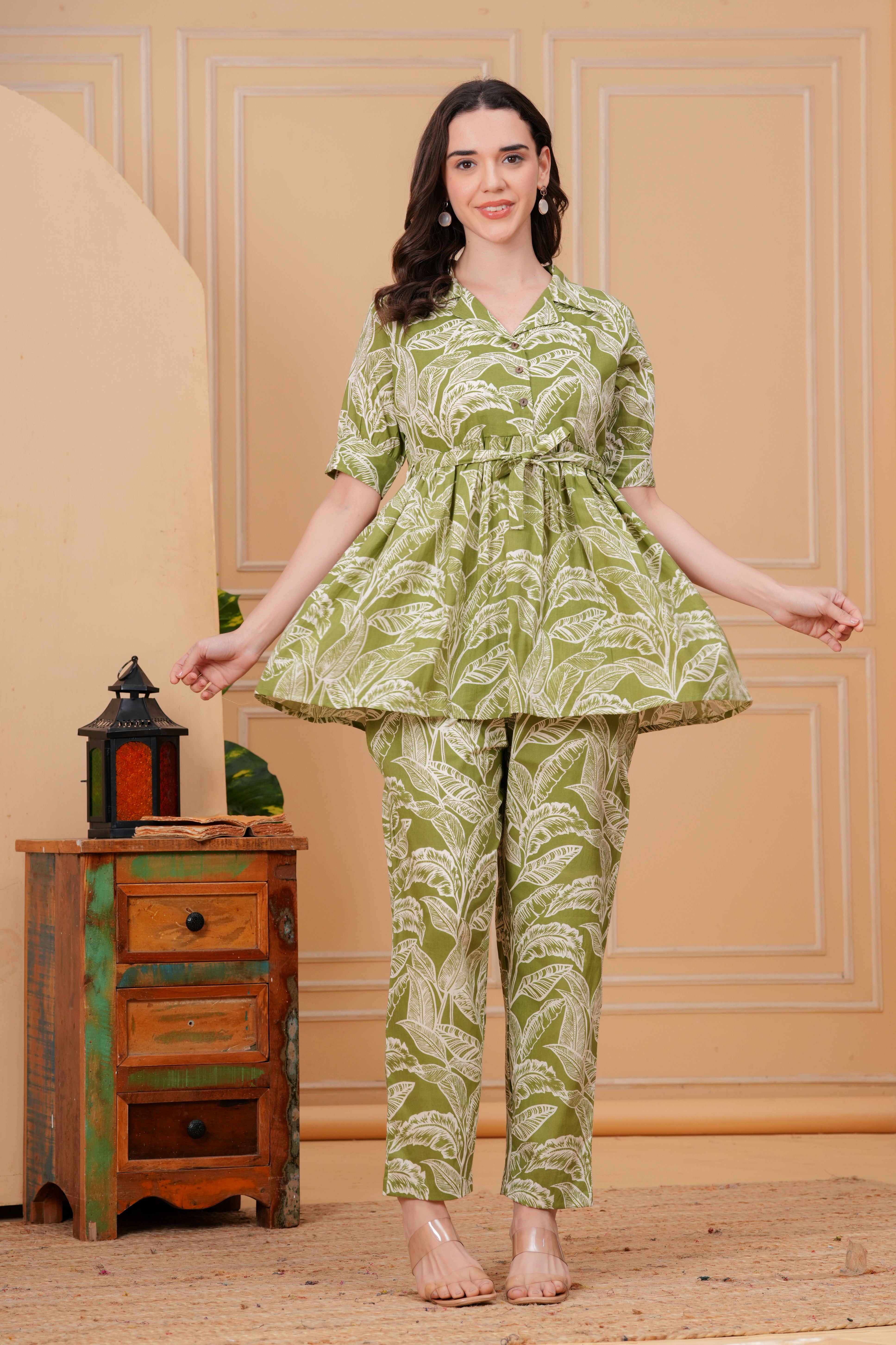 Step into refined ease with the Green Flora Co-Set, where artful botanical prints meet effortless sophistication. Set against a refreshing green base, this ensemble is elevated with expressive leaf motifs in soft contrasting tones, creating a harmonious balance of elegance and modern charm. The straight-cut kurta, detailed with three-quarter sleeves, pairs seamlessly with relaxed trousers to offer a silhouette that feels polished yet comfortably fluid. Crafted in breathable cotton, this co-ord is designed for days that call for understated luxury and versatile style.