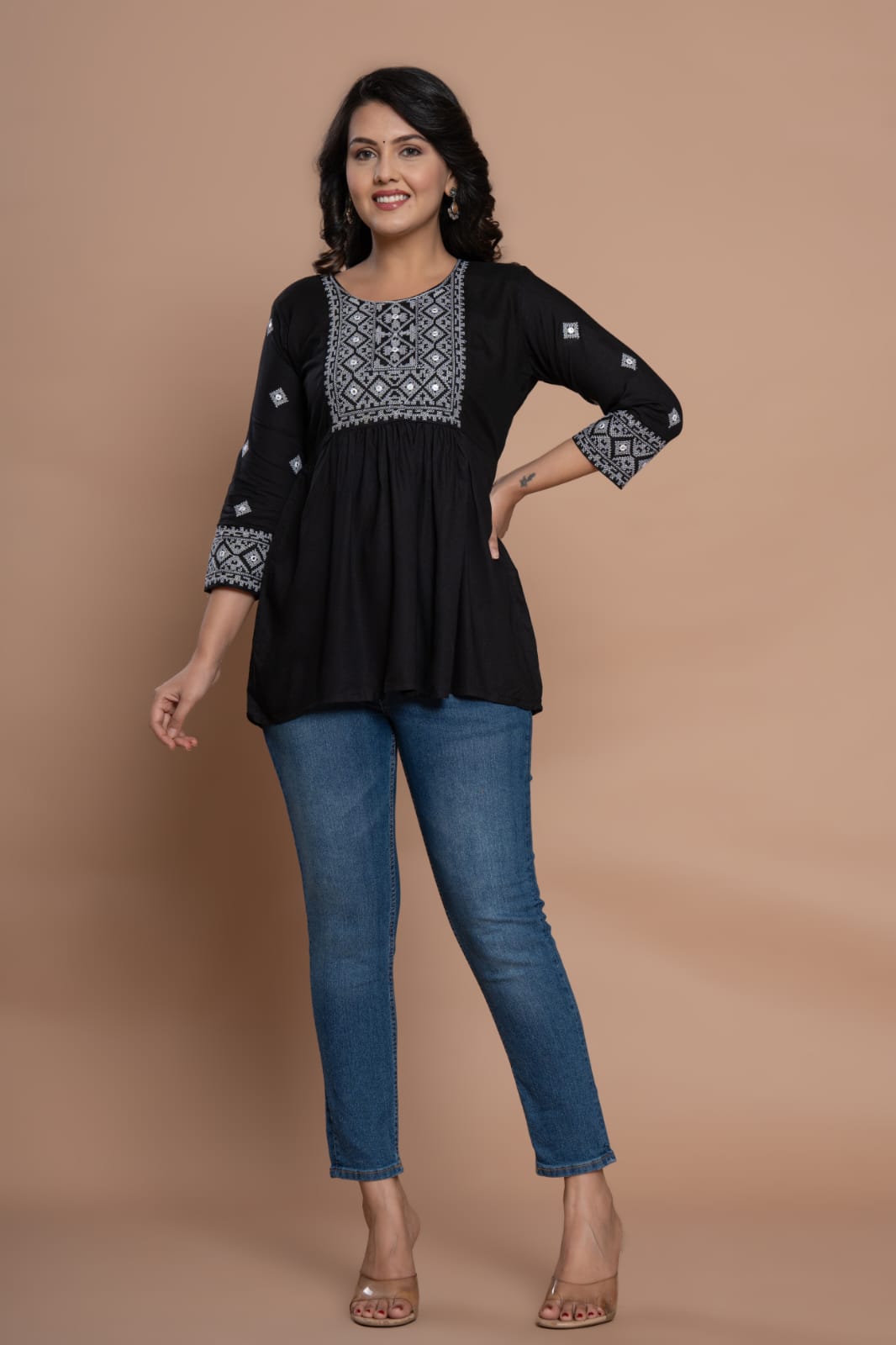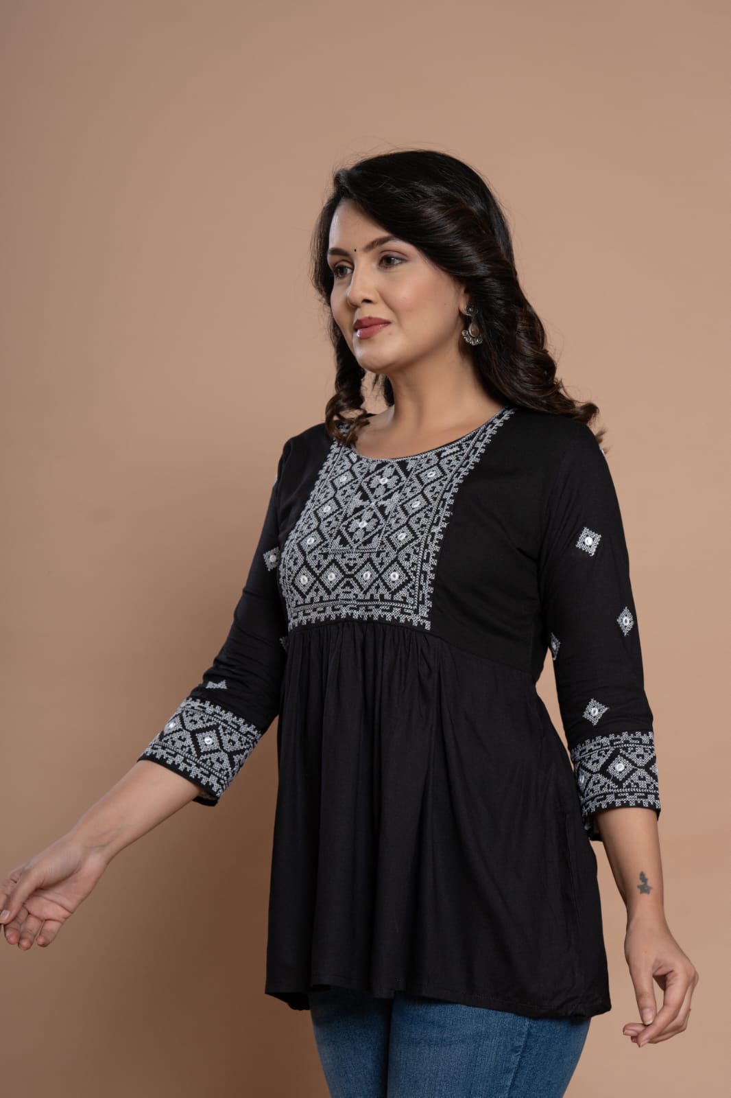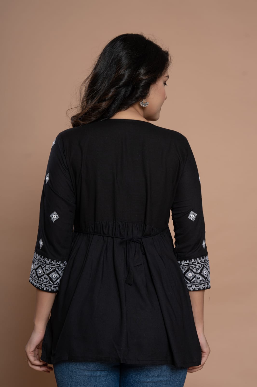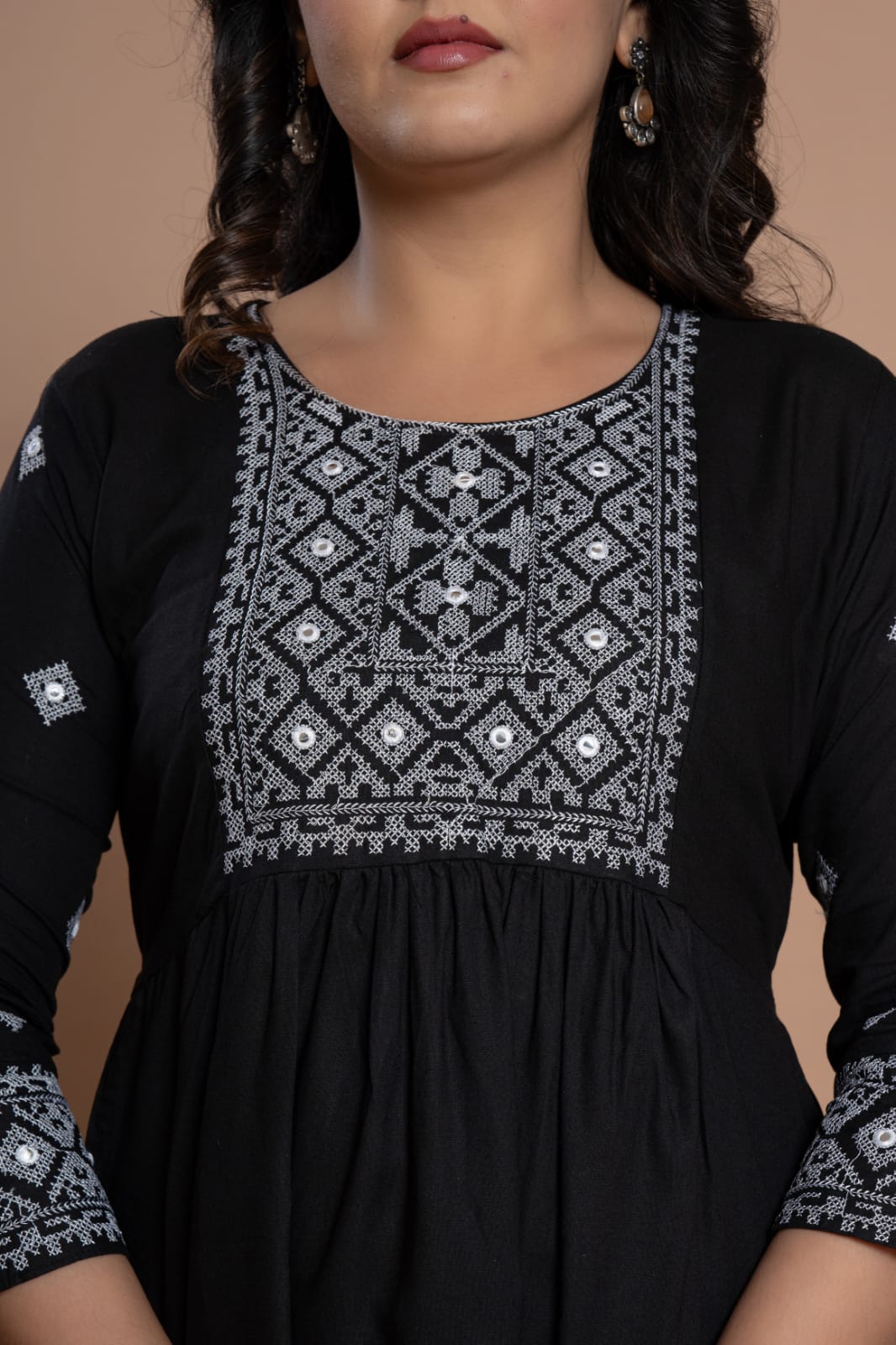 Make a bold statement with this Black Cotton Embroidered Diamond Panel Kurti. Featuring diamond-shaped embroidery with pearl accents, this kurti adds a touch of sophistication to your wardrobe. The soft cotton fabric ensures comfort and breathability, making it perfect for both casual and formal occasions.
