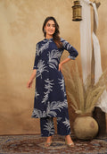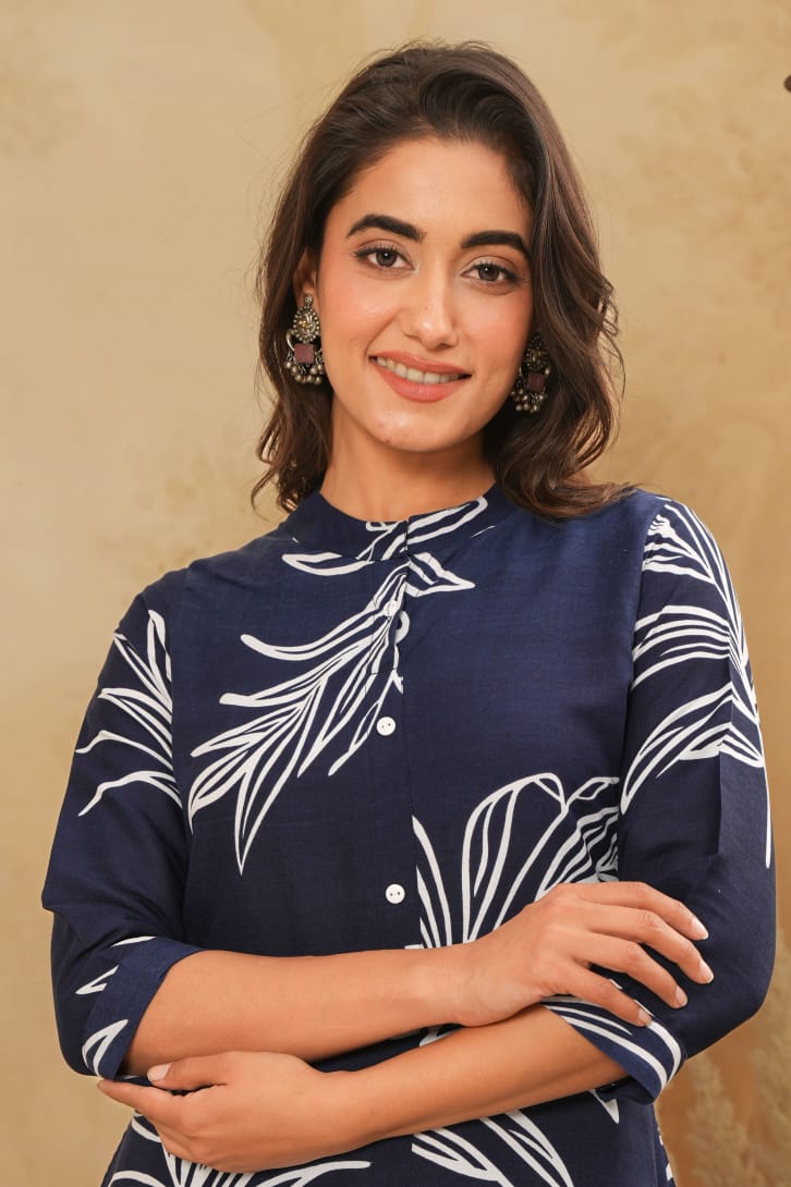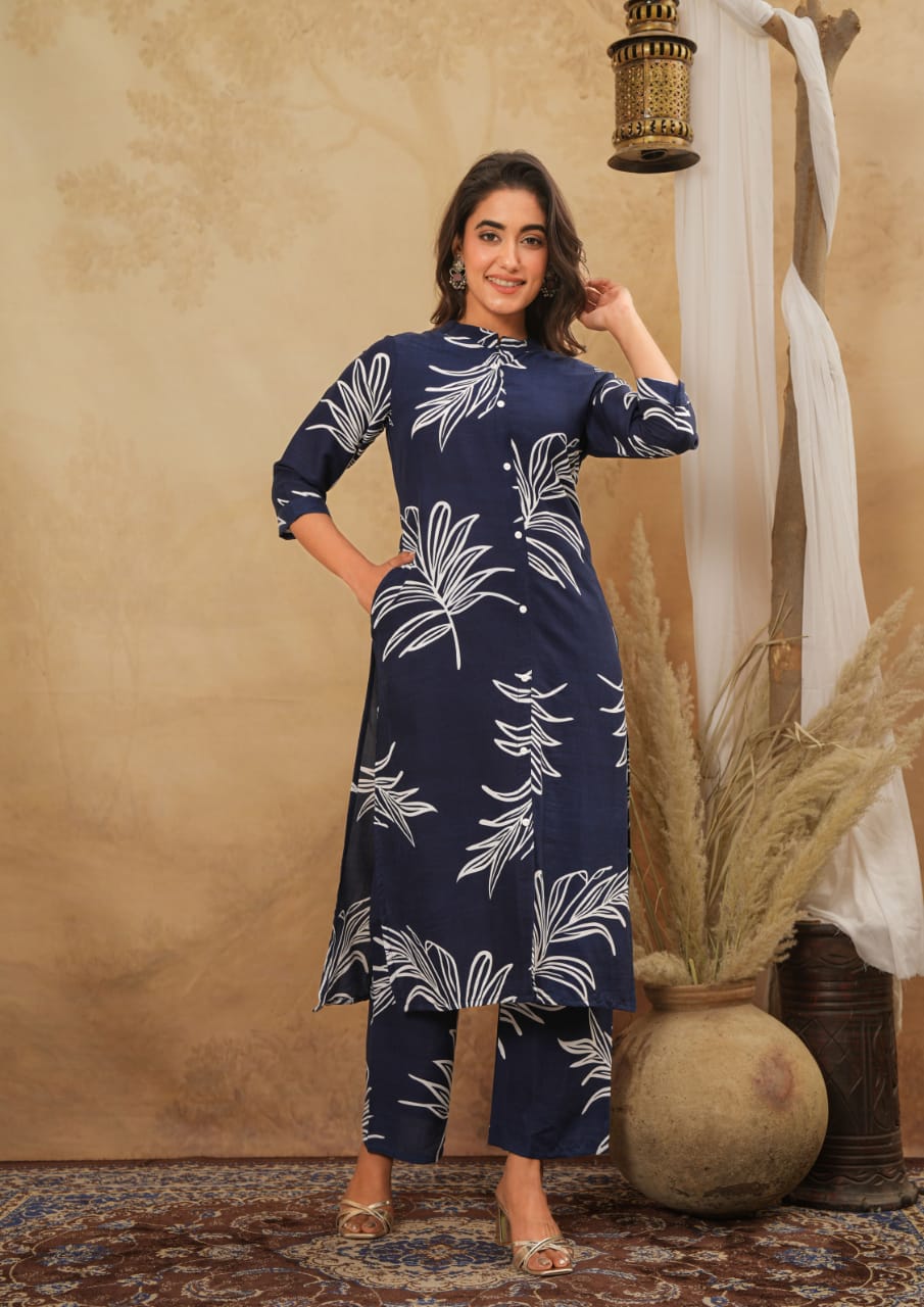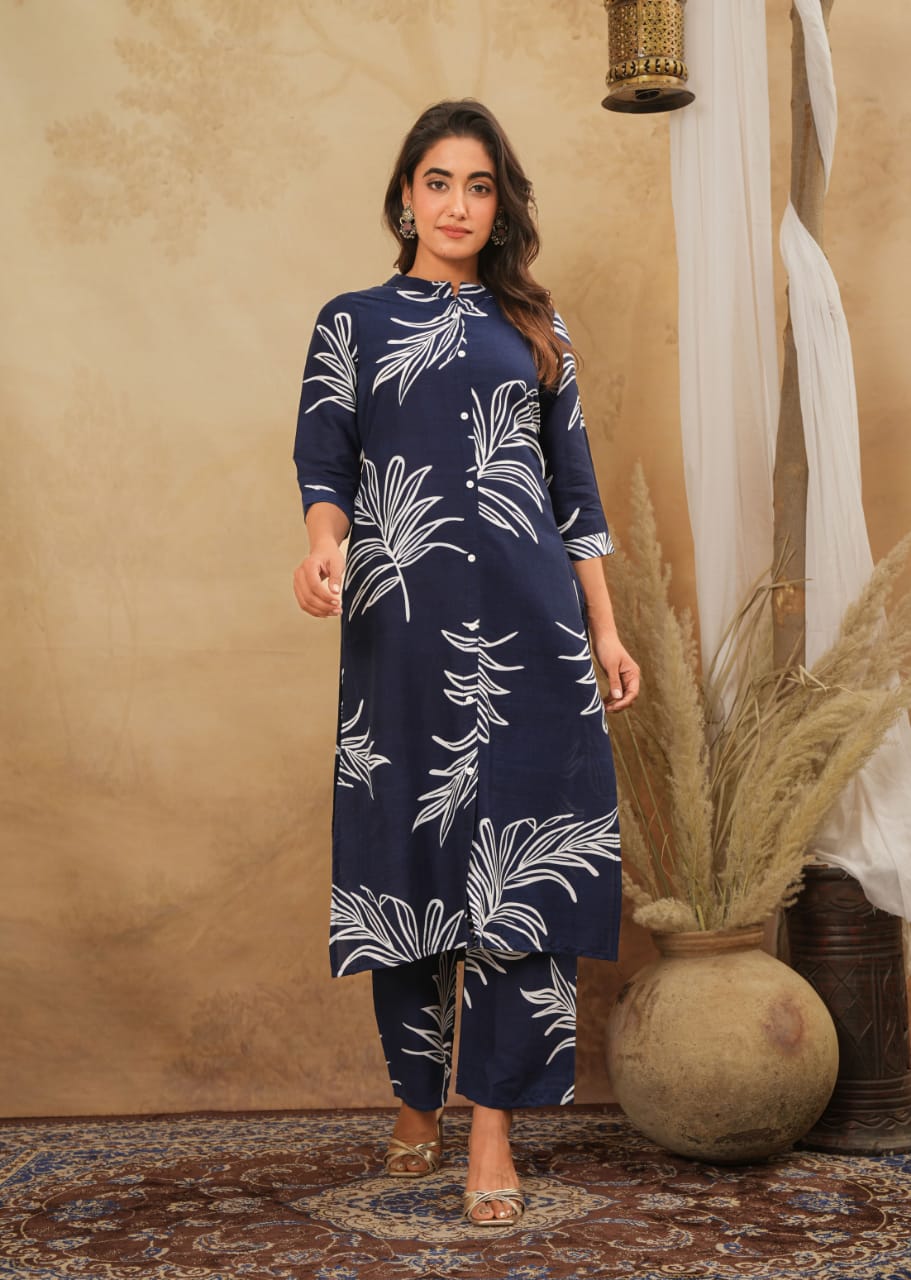Elevate your wardrobe with the Midnight Leaf Coord Set, featuring a rich navy blue base adorned with graceful white leafy, swirling patterns. The set includes a chic, button-down kurta with a flared silhouette, paired with comfortable straight-fit pants for all-day ease and elegance. Designed for both casual and semi-formal occasions, this coord set harmoniously blends modern sophistication with timeless charm, making it an essential addition to your collection.