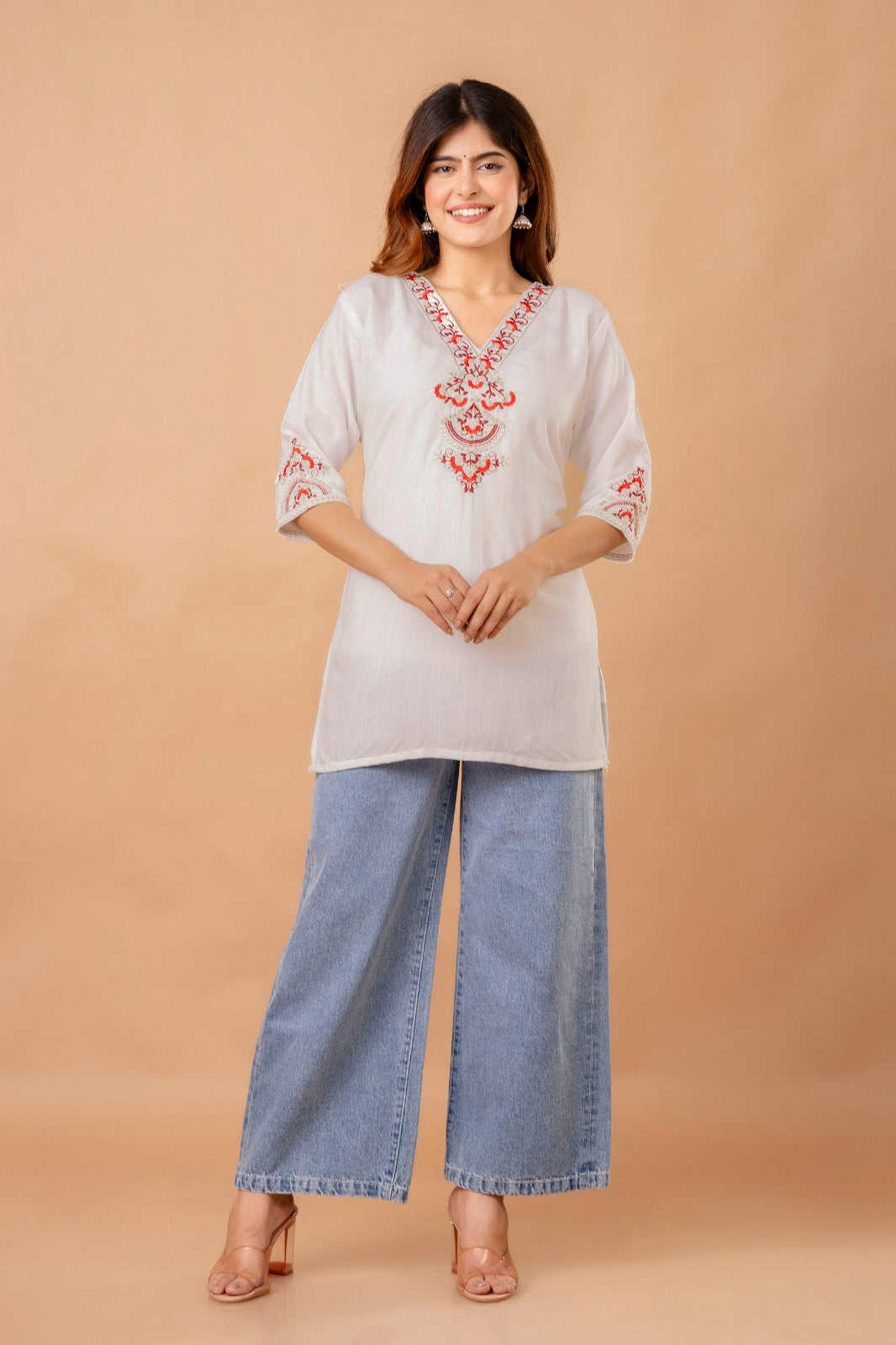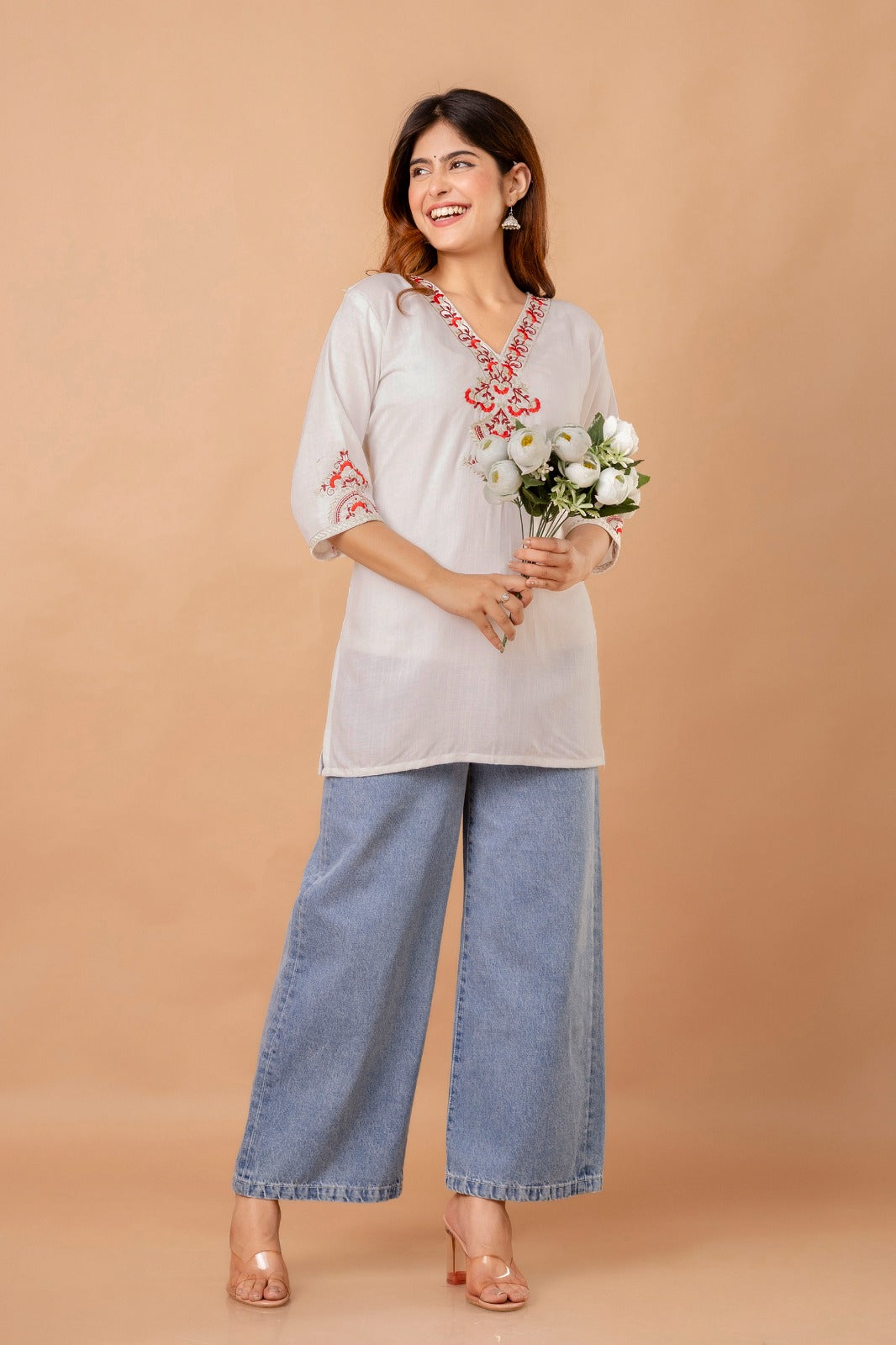 White Garden Cotton Short Kurta - White with Red Floral Embroidery