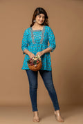 Peacock Blues Cotton Short Kurta - Turquoise & Silver Print with Lace Detailing