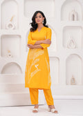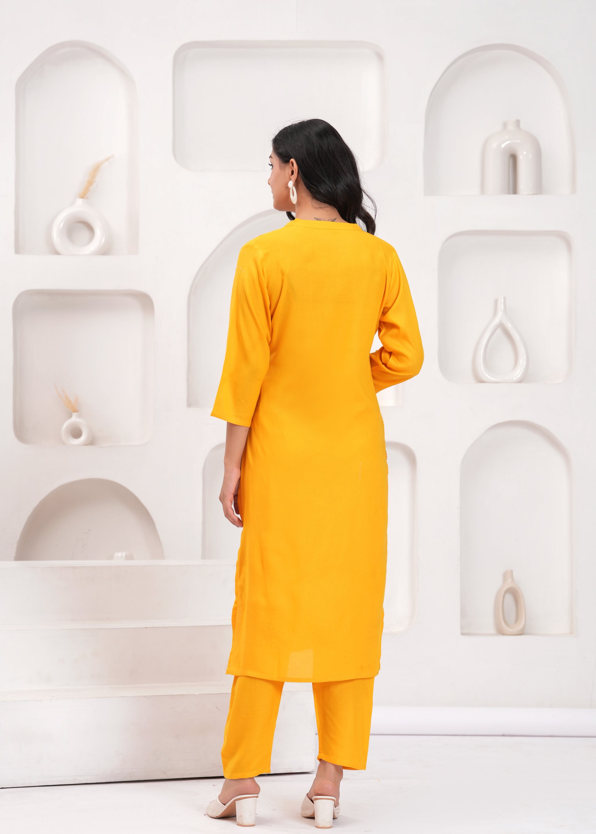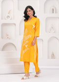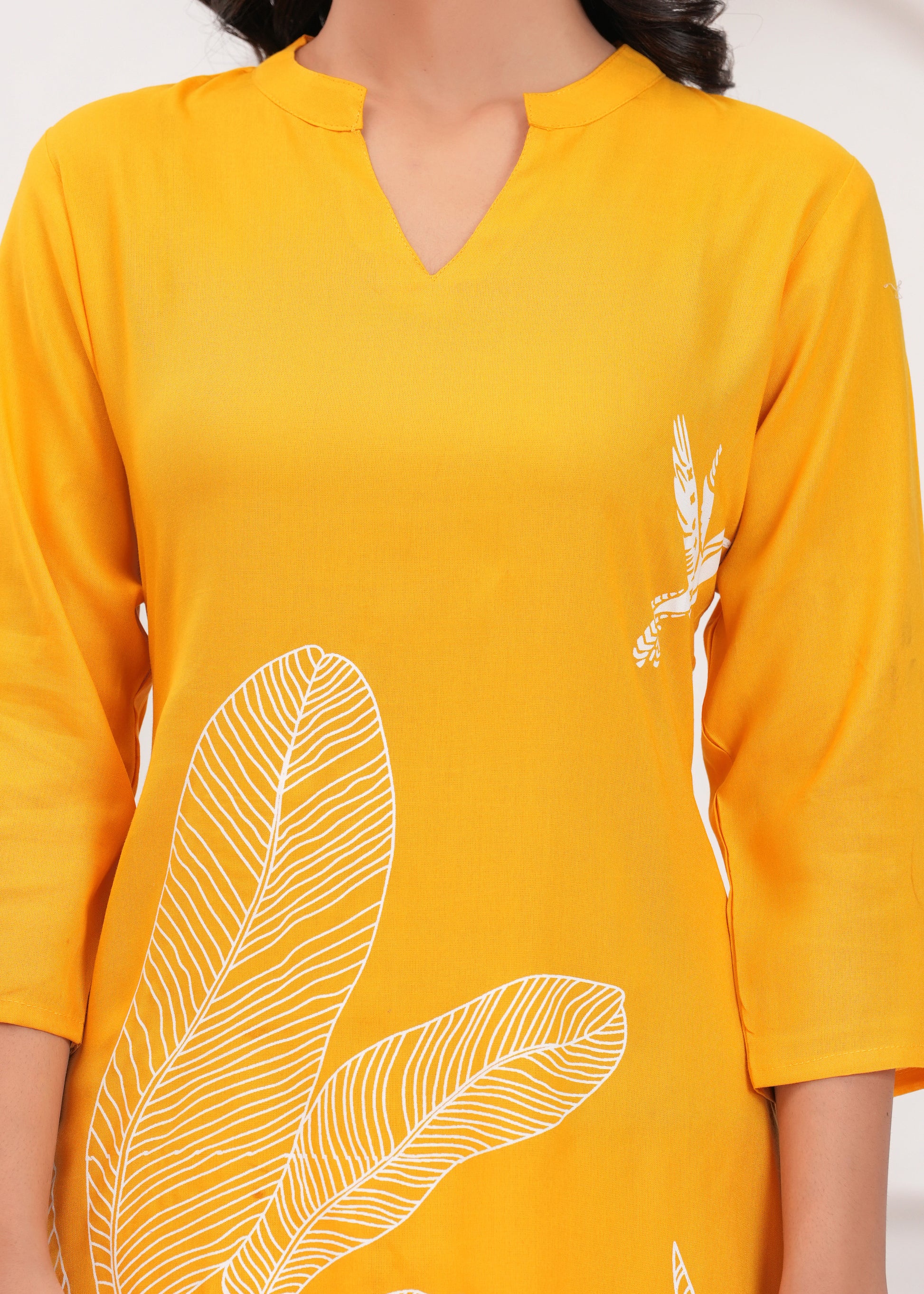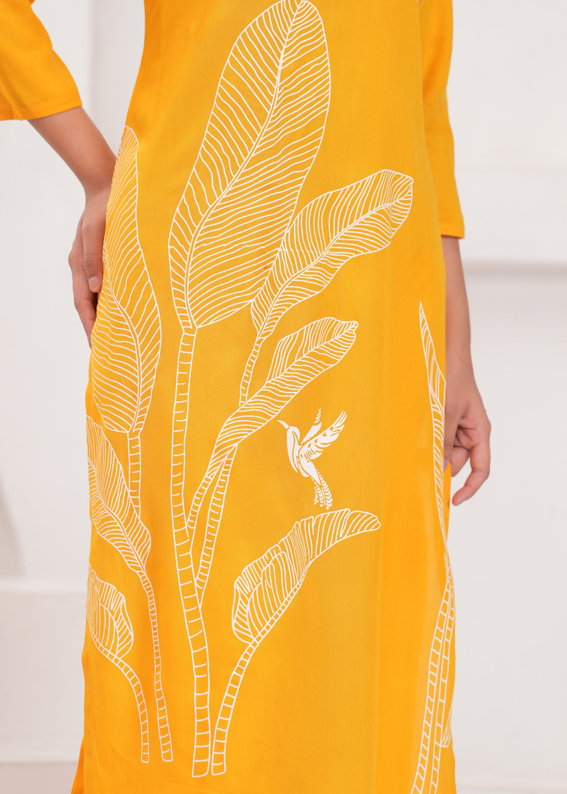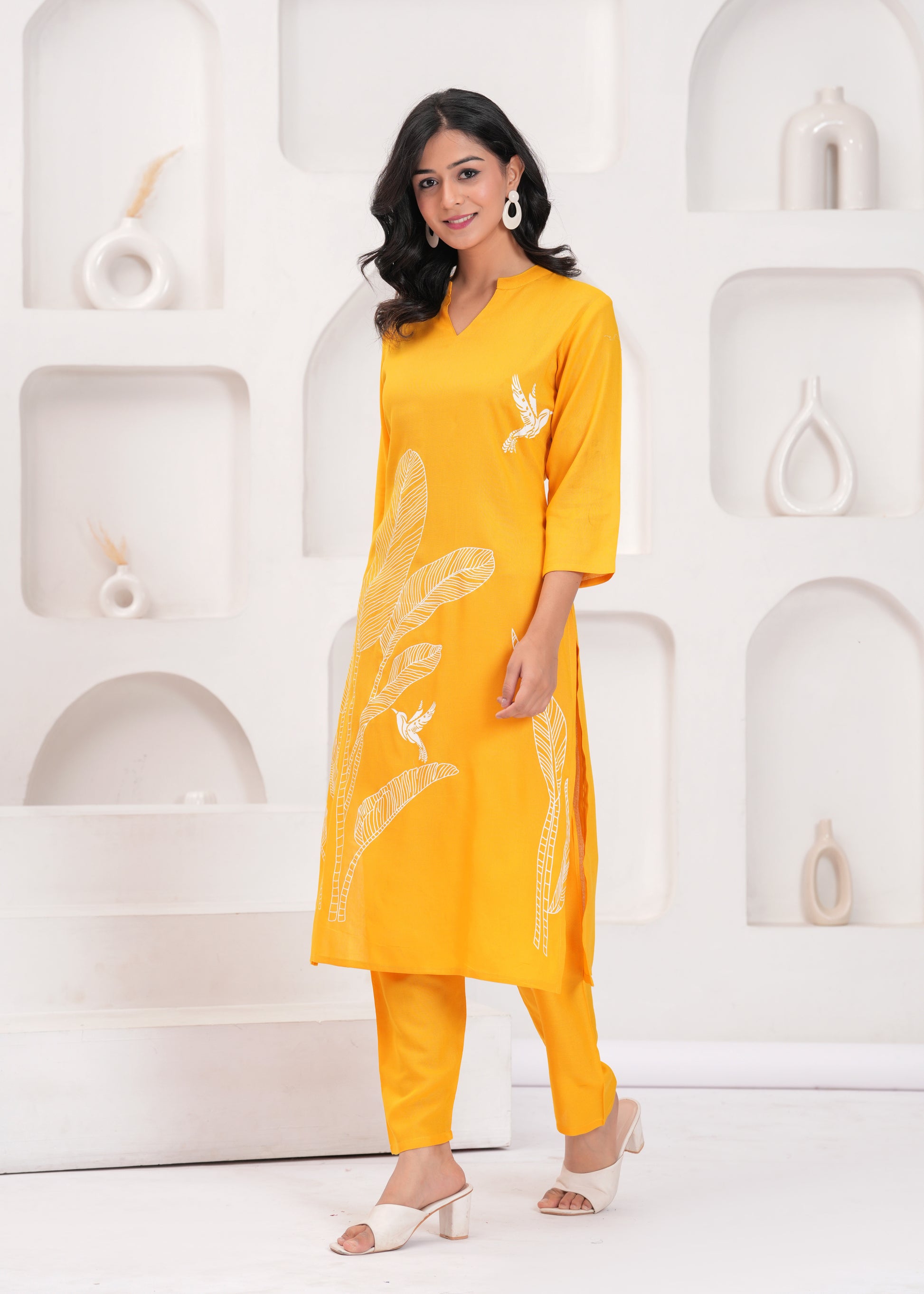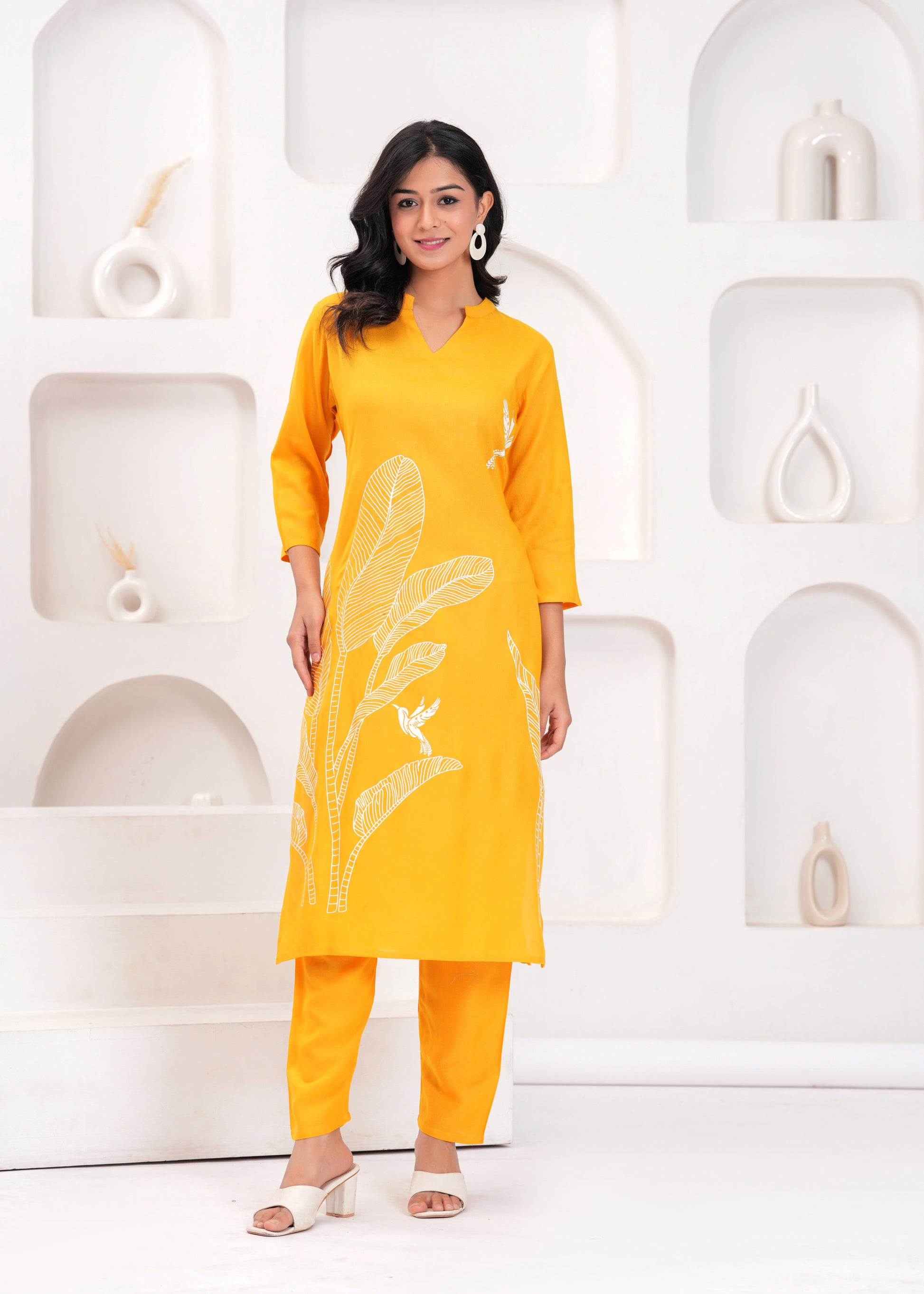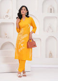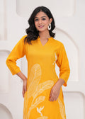 This radiant yellow co-ord set, adorned with intricate white embroidered designs of leaves and birds, is a celebration of nature and artistry. The set includes a long, straight-cut tunic and complementing tapered pants, offering both elegance and comfort. Perfect for casual outings or festive gatherings, this ensemble pairs wonderfully with white or neutral-toned heels and subtle jewelry for a polished and joyful look.