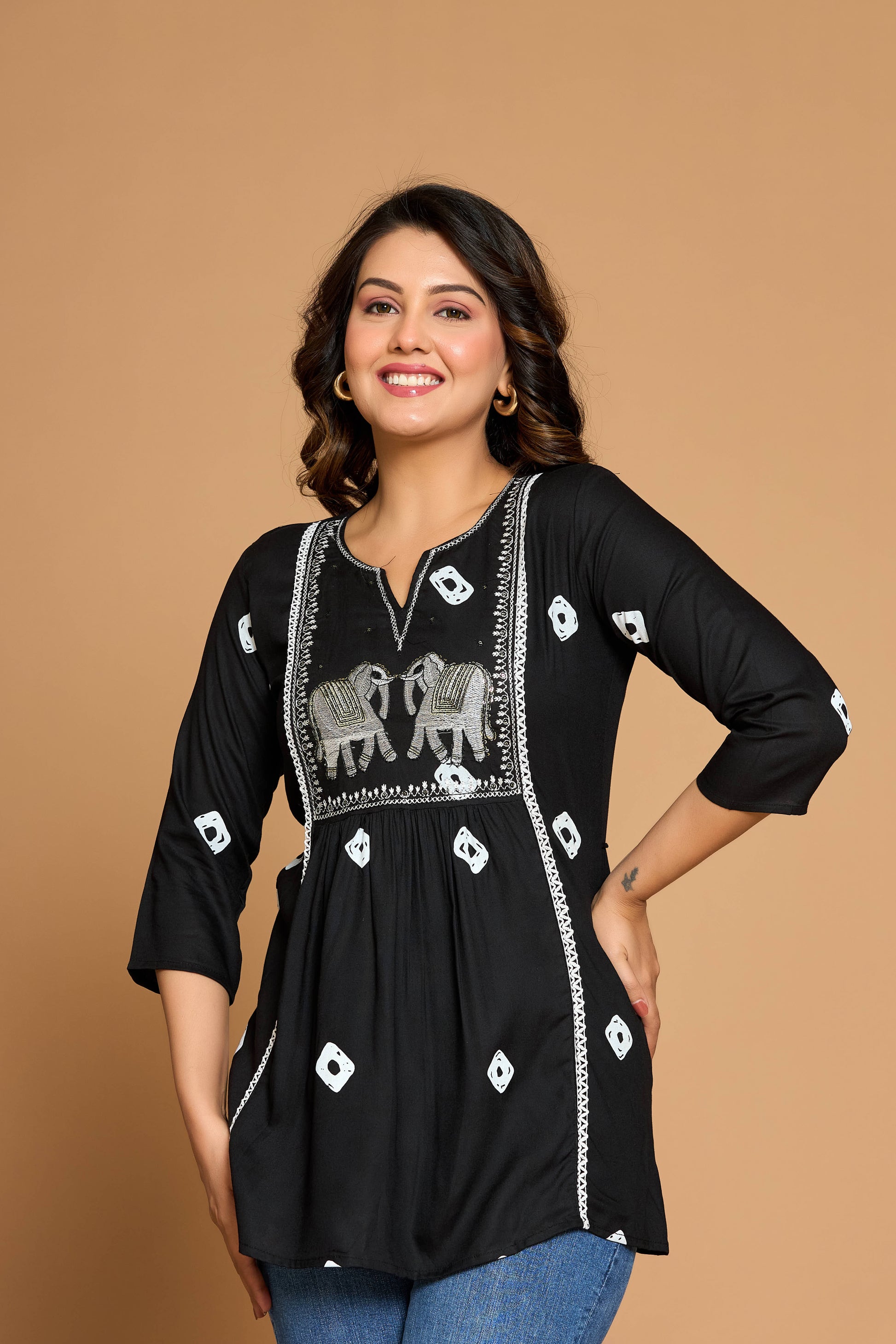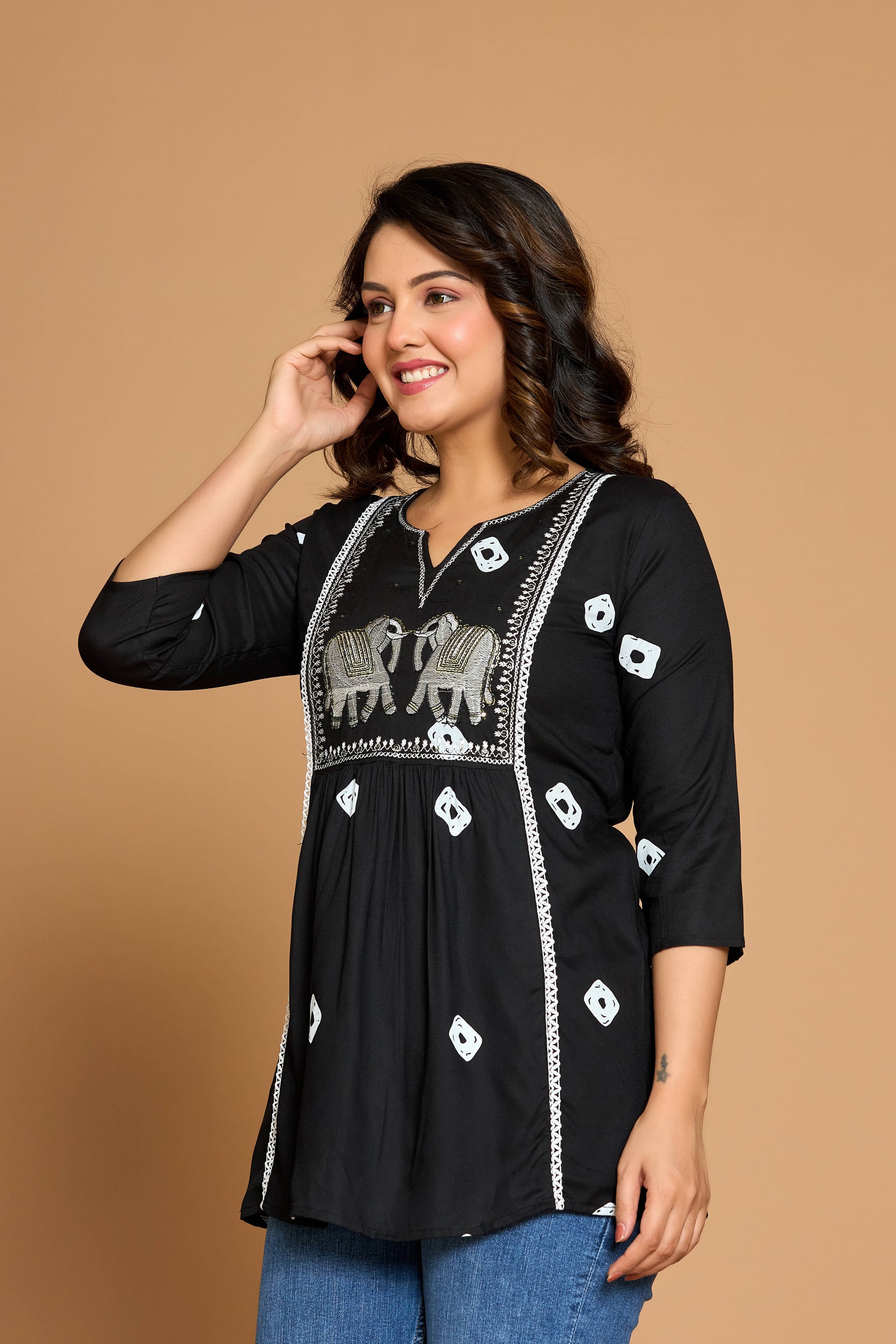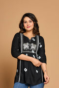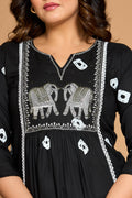 Elevate your everyday elegance with our Black Elephant Heritage Kurti—where timeless tradition blends seamlessly with modern ease. Set in a classic black hue and adorned with intricate elephant embroidery and tribal-inspired motifs, this kurti embodies the richness of heritage craftsmanship in a chic, contemporary silhouette.