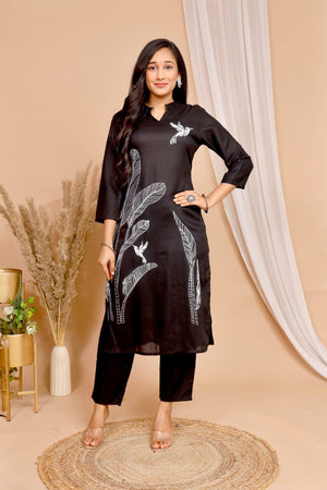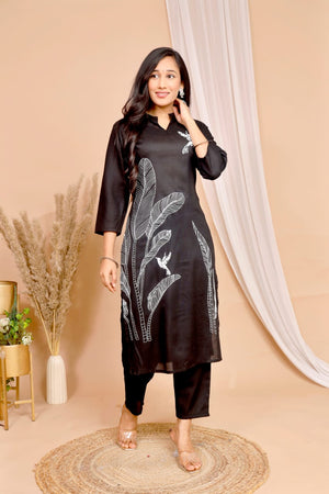 Embrace effortless elegance with our Black Bird Co-Set, a timeless blend of sophistication and contemporary charm. Crafted in a rich black hue, this ensemble features a straight kurta adorned with graceful white bird and leaf motifs that add a touch of artistic serenity to the look. The sleek silhouette, three-quarter sleeves, and mandarin neckline make it versatile for both casual outings and elevated occasions.