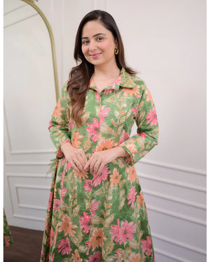 Green cord set with pink floral print. Soft fabric, collared top & matching bottom. Comfy & stylish for any day.